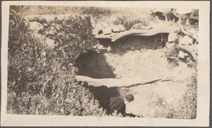 Depicts an unidentified person inside an old kiln. Handwritten caption “Thrapsano. Potter in kiln”.
