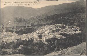 Print (commercial) showing the views of Viannos, Crete, with " Άποψις Βιάννον χωμοπόλεωσ Κρήτησ." and “Vue de Viannos (petite ville de Crete).” (View of Viannos (little village of Crete)) typed at the top of the image. No handwritten caption.