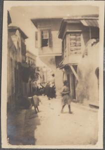 Depicts children and the buildings in a street of Candia, Crete. Handwritten caption in black ink “Street in Candia”.