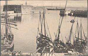 Depicts boats and the sea at Iraklion. Handwritten caption “Candia harbour”.