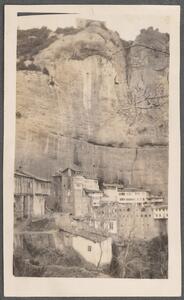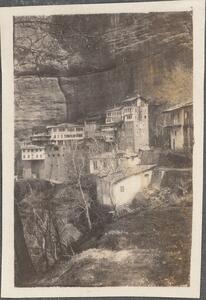 Depicts the monastery in Megaspelion, in the mountains. Handwritten caption “Megaspelion 13.4.21”.