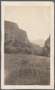 Depicts the Peloponnese hills looking south from Megaspelion. Handwritten caption in black ink: “The Gorge – Looking south from Megaspelion”.