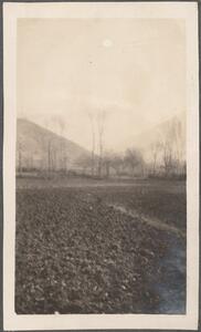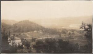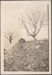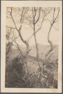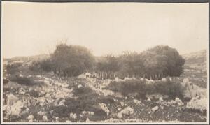 Depicts a view of the Peloponnese landscape. Handwritten caption “The wood on to Megalopolis road".