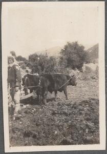 Depicts a local Greek man and a plough at Manika. Handwritten caption “Manika to Langadia”.