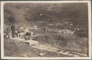 Depicts three people at the ruins in the Peloponnese. Handwritten caption “The theatre – Megalopolis 16.4.21”.
