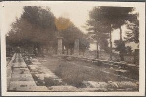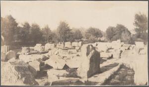 Depicts the ruins of the temple of Zeus at Olympia. Handwritten caption “Temple of Zeus. Olympia”.