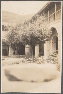 Depicts the building and courtyard, with the stairs of the building and the trees. No further caption.
