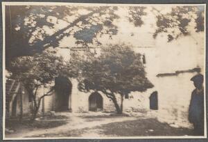 Depicts the building and courtyard, and a man at the corner. No caption.
