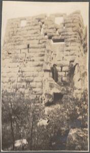 Depicts the ruin of a fortress of Attica. Handwritten caption “Tower – on road to Velia from Hagi/Mani??” On the top right corner of the album page is written “VELIA & H. Meletios. From this fortress of Attica. 13-14 May”. Between this and the next image Helen Waterhouse has written "Oenoe".