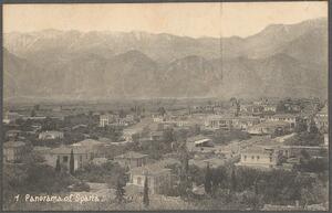 Print (commercial) showing the town of Sparta with the mountains at the background, with “1 Panorama of Sparta” inscribed in white at the bottom of it