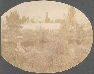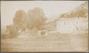 Depicts a building and the landscape of Attica. (Vilia, Oenoe, Kytheron). Handwritten caption:” Hagios Meletios”