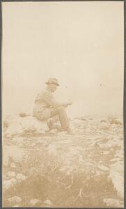 Shows Welch sitting on a rock at Hymettus. Handwritten caption: “Hymettus 8. 5. 21”. Another handwritten caption, by Helen Waterhouse, says "Uncle Welch"