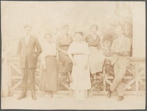 Depicts, in order, possibly Dorothy Ashmole, Lilian Chandler, Winifred Lamb, Bernard Ashmole, Mary Herford (later known as Braunholtz) and Francis L. Lucas on the B.S.A. terrace. No caption.