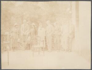 Depicts, in order, Lilian Chandler, Mr Welch, Winifred Lamb, Mary Herford (later known as Braunholtz), Stanley Casson, Leonard Wooley, Bernard Ashmole and Mr Lucas on the B.S.A. terrace. Handwritten caption, under each person, “Chandler, Welsh, Lamb, Herford (later known as Braunholtz), Casson, Wooley, Ashmole, Lucas.”
