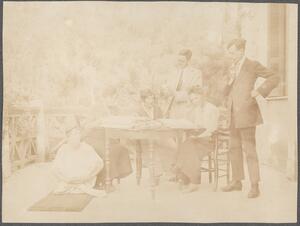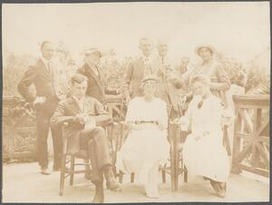 Depicts possibly Leonard Woolley, Francis L. Lucas, Winifred Lamb, Stanley Casson, possibly Dorothy Ashmole, Francis B. Welch, Lilian Chandler and Mary Herford (later known as Braunholtz) on the B.S.A. terrace. No caption.