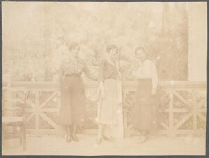 Depicts Lilian Chandler, Winifred Lamb, Mary Herford (later known as Braunholtz), the Finlay balcony of the BSA Macmillan Hostel. No caption.