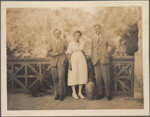 Depicts Axel Boethius and Mr and Mrs Hondius (JJE Hondius and MA can Hoaften-Hondius) on the B.S.A. terrace. Handwritten caption below each person “AB, The Hondii”.