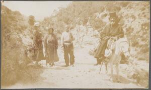 Depicts Winifred Lamb, the Albanian Family and Father Jacob on a donkey. Handwritten caption “WL. The Albanian family, Father Jacob”