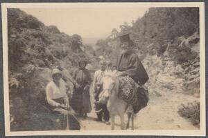 Depicts Lilian Chandler, the Albanian Family and Father Jacob on a donkey. No caption.