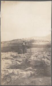 Depicts Winifred Lamb at the excavation and ruins at Mycenae. Handwritten caption "W.L."
