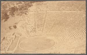 Depicts the ruins of a theatre. Handwritten caption: “Epidourios MABH”