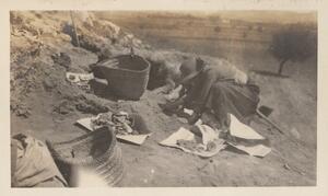 Depicts Winifred Lamb and Basil digging out pots. Handwritten caption: “Zygouries. WL & Basil digging out pots”. Under the image, with the same handwriting, it’s written CB; it is unclear whether this is related to this photograph or the one below.