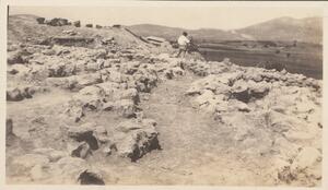 Depicts Carl Blegen (ASCSA) (not clear) at the ruins of Zygouries’ main street. Handwritten caption "Zygouries. The Main Street”; above the figure is written CB, although it is unclear whether this is related to this image or the one above.