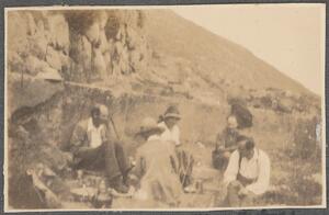 Depicts Georgi, Lilian Chandler, Mary Herford (later known as Braunholtz), Axel Boethius and Alan Wace at Mycenae. Handwritten caption: “Lunch: Giorgi. LC. MH. AB. AJBW. “Κεφτιδες again!””