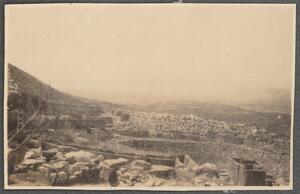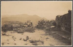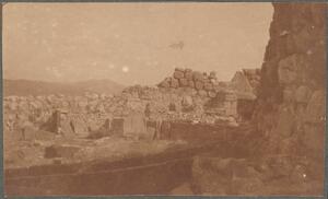 Depicts the ruins at Mycenae. Handwritten caption: “The Palace court. Looking towards Kyllene.”