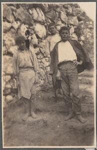 Depicts the ruins at Mycenae and three boys, Niko, Pandalis and an unidentified boy. Handwritten caption “The (…) Basil. Niko. Pandalis”