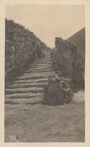 Depicts the ruins of the palace’s staircase, with an unidentified woman sitting there. Handwritten caption: “The Palace staircase”.