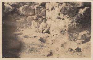 Depicts Georgi and Andrew at the ruins at Mycenae. Handwritten caption: “The Terrace(?) of the Pithoi” Giorgi and Andrew”.