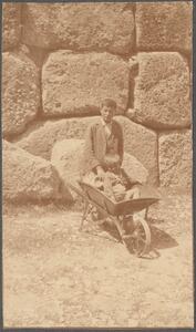 Depicts Pandelis and Georgi’s little boy in a wheelbarrow at the ruins and excavation site. Handwritten caption: “Pandelis & Georgi’s little boy”