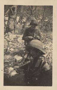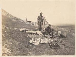 Depicts two unidentified men working with the finds found at the excavation, probably Vardarovca. No caption.