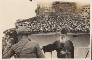 Depicts an orthodox priest talking with an unidentified man at Elassona. Handwritten caption: “Elassona. Entertainment at Monastery”.