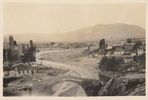 Depicts the landscape of the town, with the bridge and the river, probably Elassona. No caption.