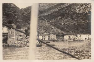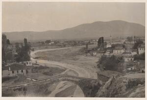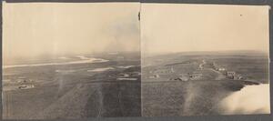 Depicts a panoramic view, made by two photographs cut and pasted together, of the fields, houses and river. No caption. Probably near Vardarovca.