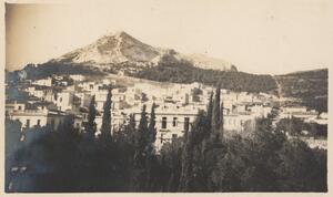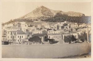 Depicts the view of Mount Lycabettus and the city of Athens. Handwritten caption, made by Helen Waterhouse, “Lycabettus”.