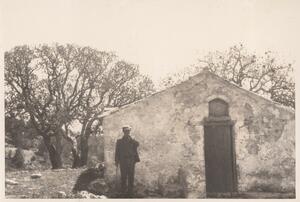 Depicts an unidentified man in front of an old house. Handwritten caption: “On the way to Tatoi”, and at the corner “1. V 25”. Enlarged version of LAM/3/1/8/58