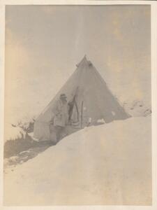 Depicts an unidentified man outside of a tent, surrounded by snow. No caption.