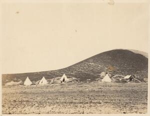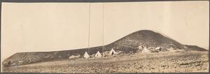 Panoramic photograph, made with three photographs cut and pasted together, showing the tents, probably of the Vardarovca excavation. No caption.