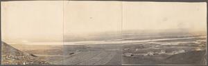 Depicts a panoramic view, made by three photographs cut and pasted together, of the fields, houses and river. No caption. Probably near Vardarovca.