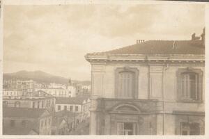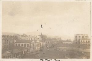 Depicts the view of the city, with the Stain building at the background. There is an arrow drawn in the photograph, pointing the building. Handwritten caption “P. O. Opposite Flokas”.