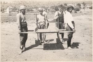 Depicts four of the workers; two carrying an empty hand-barrow that they used in the excavation of Thermi and two standing behind. No caption.