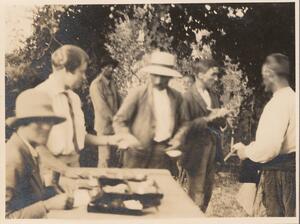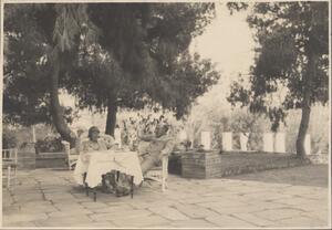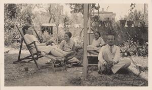 Depicts Winifred Lamb, Nine Six, Jean Mitchel and Hutchinson (?) in their garden, relaxing. Handwritten caption “Sunday afternoon”. Helen Waterhouse wrote “WL, NS and Squire H. under each of them”.