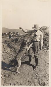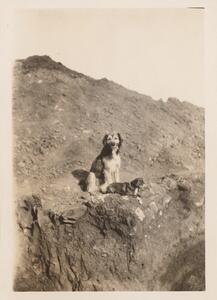 Depicts her feeding the dog at the Thermi excavation. It’s a little bit unglued and at the back is written “Buau for Bébé”. At the centre of this page is written “Expert oppinion”.