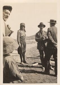 Depicts some of the workmen and Winifred Lamb at the excavation of Thermi. Handwritten caption “Consultation”.