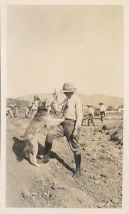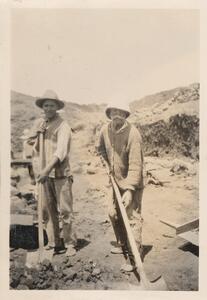 Depicts the two workmen, posing at the excavation of Thermis. Handwritten caption “Kosti & Ianni posing”.