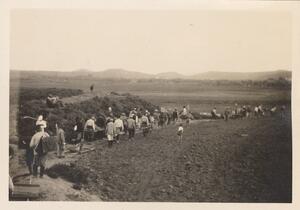 Depicts a woman, probably Winifred Lamb, talking with the workers at the Thermi excavation. No caption.