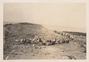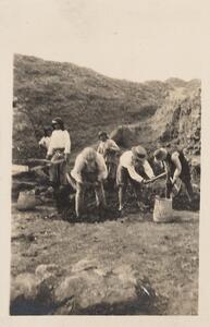Depicts some of the workers at the excavation of Thermi. Hanwritten caption: “Getting the Pithos out of Γ”.